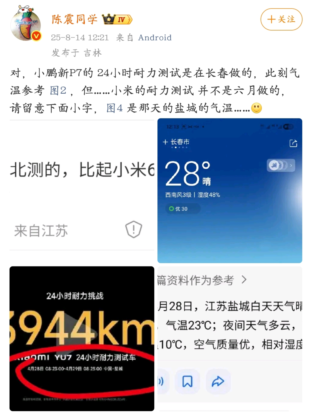 更有意思的是,陈震还将小鹏新P7和小米YU7耐力测验时不同的区域气温拿出来做了比较,陈震称小鹏新P7是在28度的长春做的测验,而小米YU7是在23度的盐城做的测验。