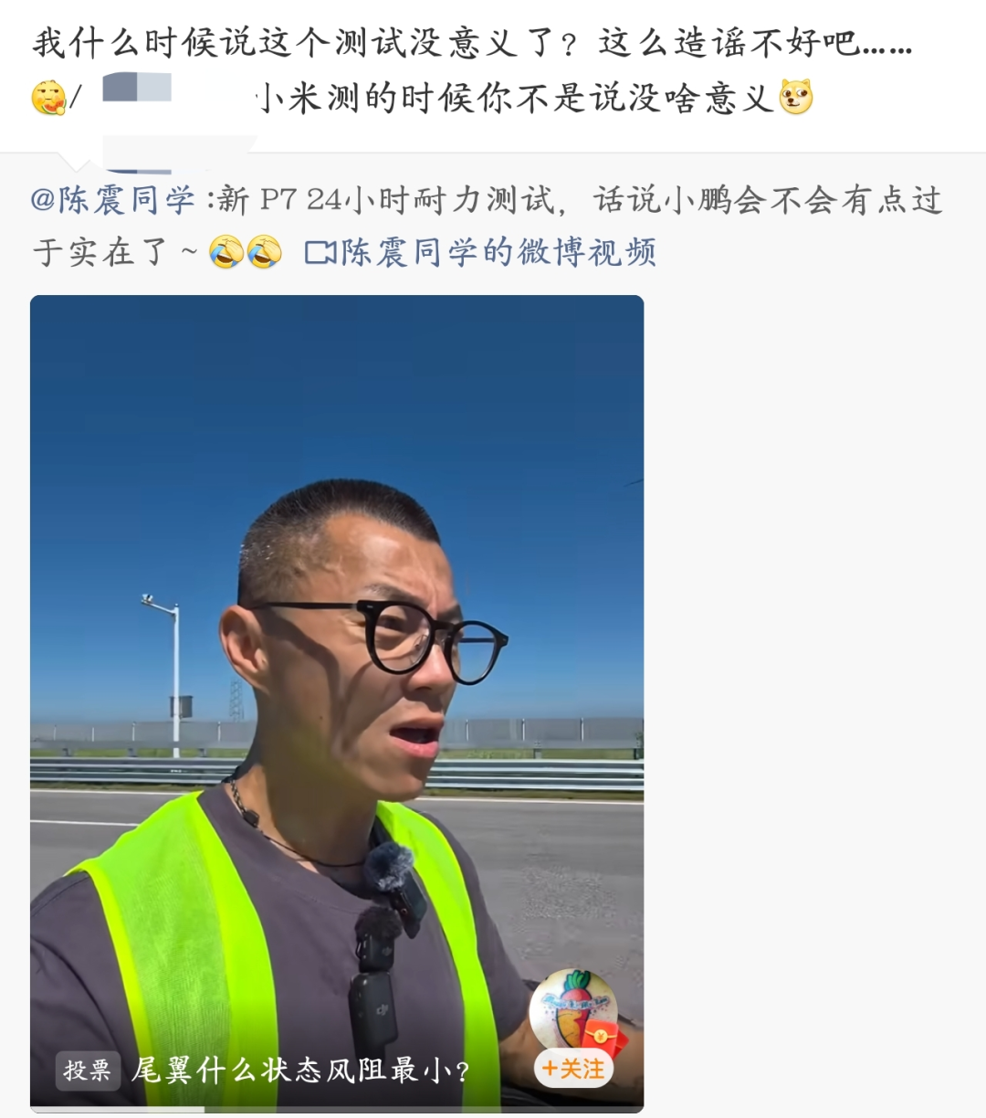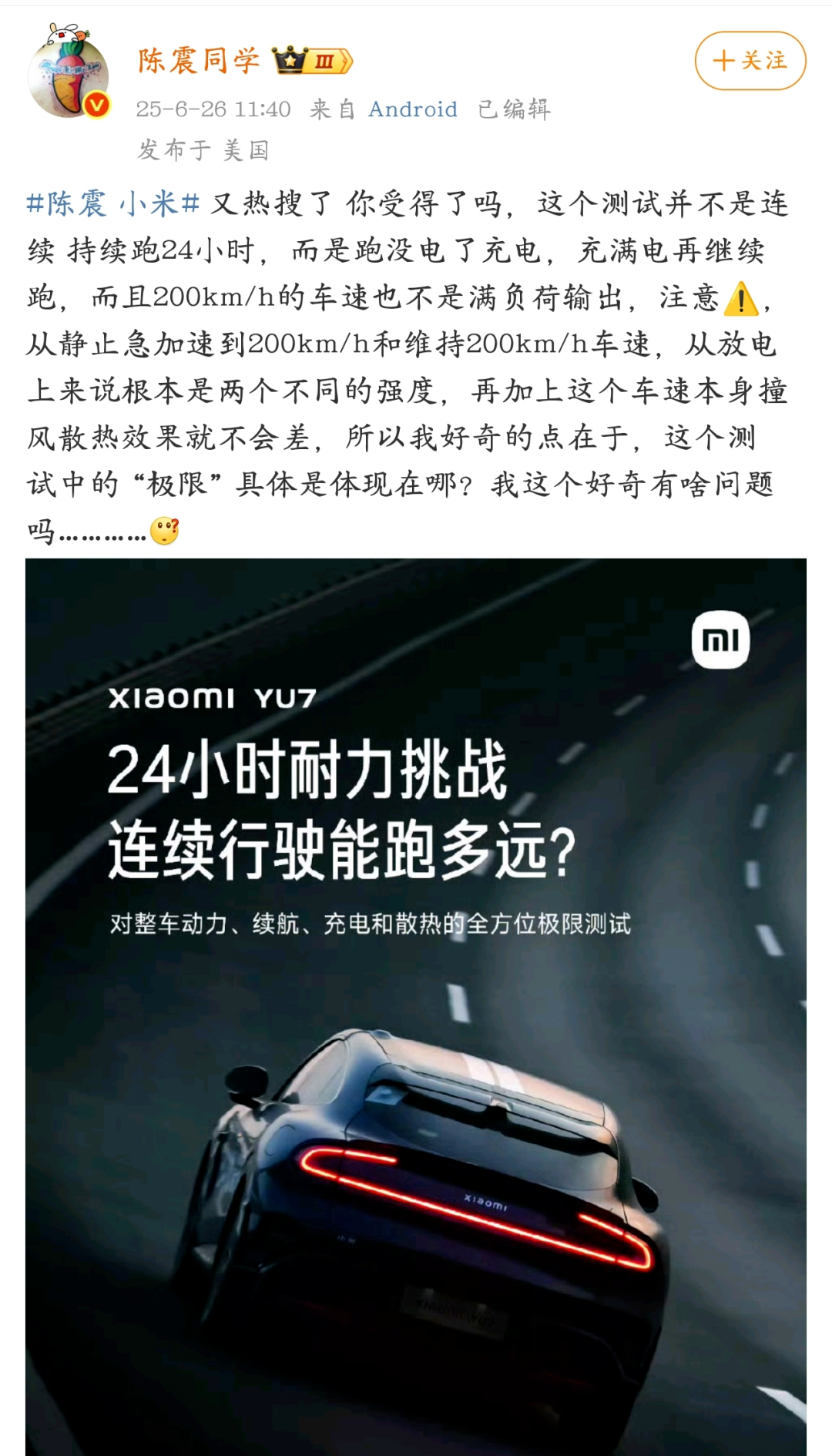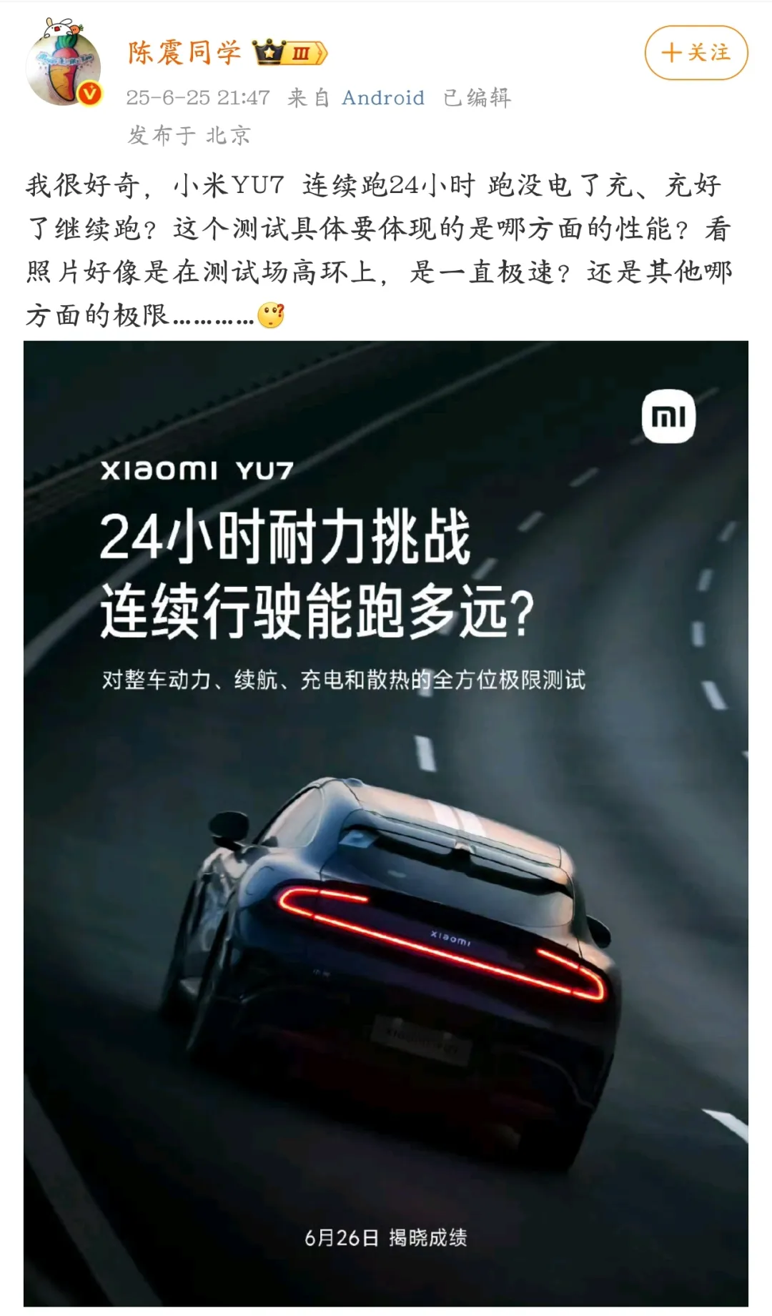 这样的质疑,与之前小米YU7做24小时耐力应战时陈震连发数条微博责问有关——