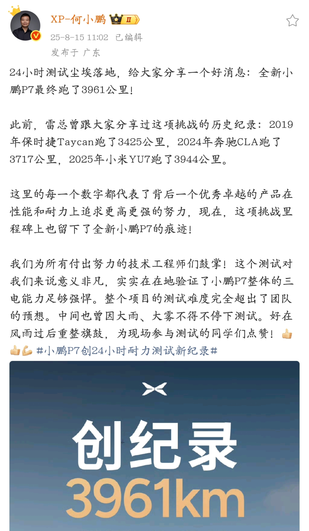 一起,何小鹏着重,“此前,雷总曾跟咱们共享过这项应战的历史纪录:2019年保时捷Taycan跑了3425公里,2024年奔驰CLA跑了3717公里,2025年小米YU7跑了3944公里。这儿的每一个数字都代表了背面一个优异杰出的产品在功能和耐力上寻求更高更强的尽力,现在,这项应战里程碑上也留下了全新小鹏P7的痕迹!”