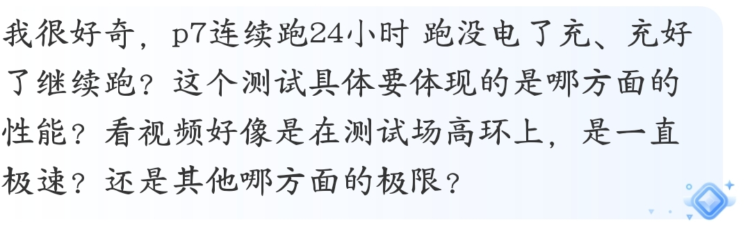 有的网友直接用此前陈震对小米YU7的质疑来表态,“我很猎奇,p7接连跑24小时跑没电了充、充好了持续跑?这个测验详细要体现的是哪方面的功能?看视频如同是在测验场高环上,是一向极速?仍是其他哪方面的极限?”