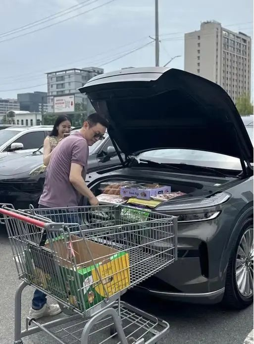 两人在超市购买日常用品,逛完超市后,李斌将收购的物品一件件放入前备舱,大大方方的展现了一波乐道L90引以为傲的前备舱空间。