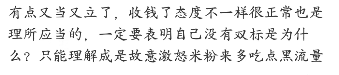 也有的网友直言标明,“有点又当又立了,收钱了情绪不一样很正常也是理所应当的,一定要标明自己没有双标是为什么?只能了解成是成心激怒米粉来多吃点黑流量。”