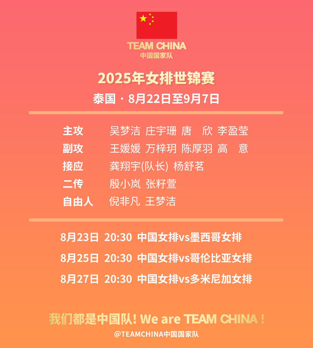 2025年女排世锦赛将于北京时间8月22日至9月7日在泰国举办。